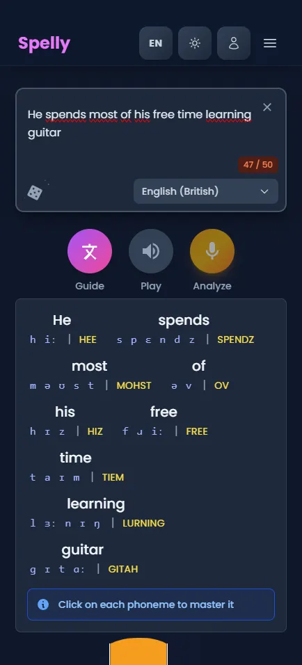 Get instant, detailed feedback on your pronunciation. Our AI analyzes your speech and helps you improve with precise, actionable insights.