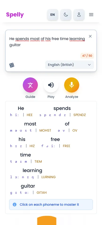 Get instant, detailed feedback on your pronunciation. Our AI analyzes your speech and helps you improve with precise, actionable insights.